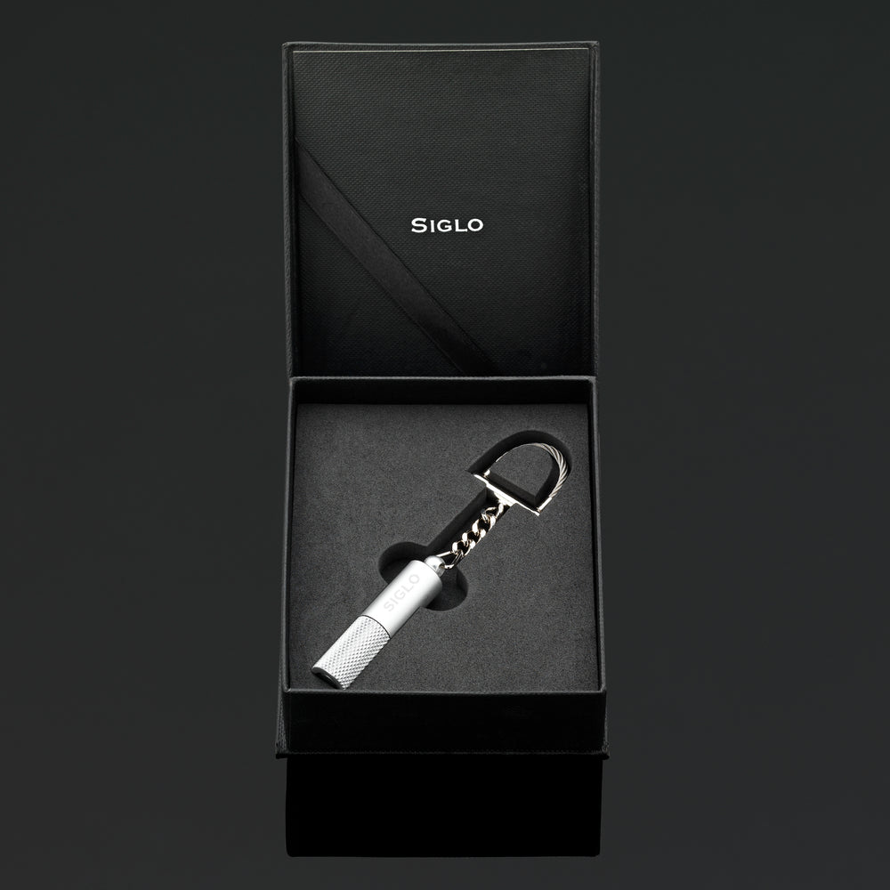 Experience the ultimate convenience with the Siglo Punch Cutter Key Ring! No more need for separate tools, as this innovative device combines a punch cutter and key chain into one sleek design. Effortlessly cut your cigar with its rotating mechanism, while the sand finishing adds a touch of sophistication. Say goodbye to the hassle of carrying multiple items and hello to the perfect cigar experience with the Siglo Punch Cutter Key Ring.
