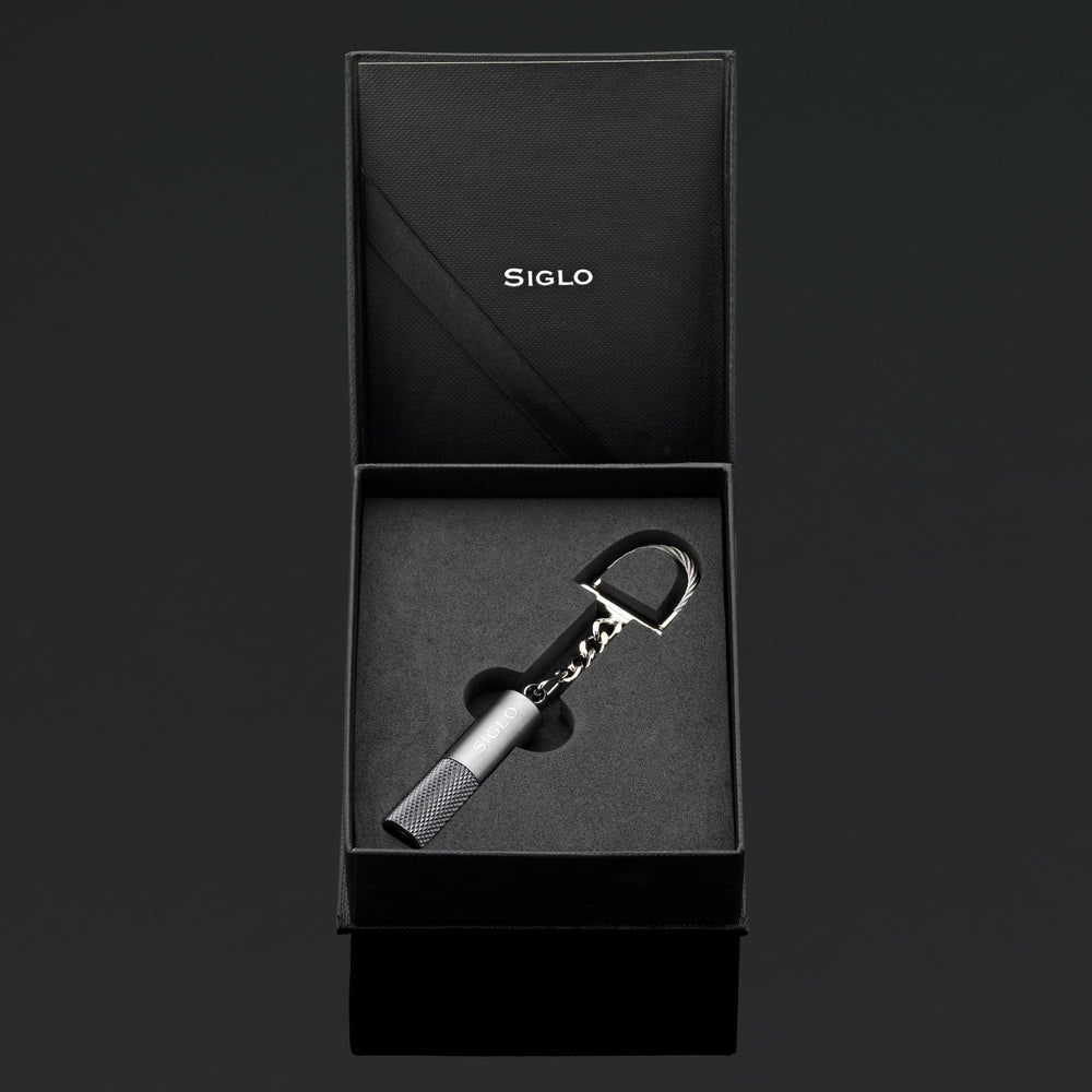 Experience the ultimate convenience with the Siglo Punch Cutter Key Ring! No more need for separate tools, as this innovative device combines a punch cutter and key chain into one sleek design. Effortlessly cut your cigar with its rotating mechanism, while the sand finishing adds a touch of sophistication. Say goodbye to the hassle of carrying multiple items and hello to the perfect cigar experience with the Siglo Punch Cutter Key Ring.