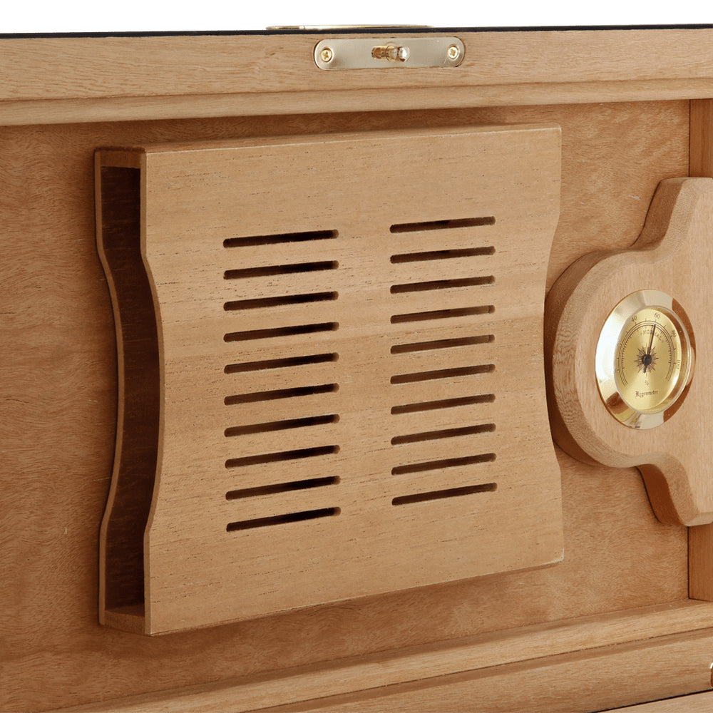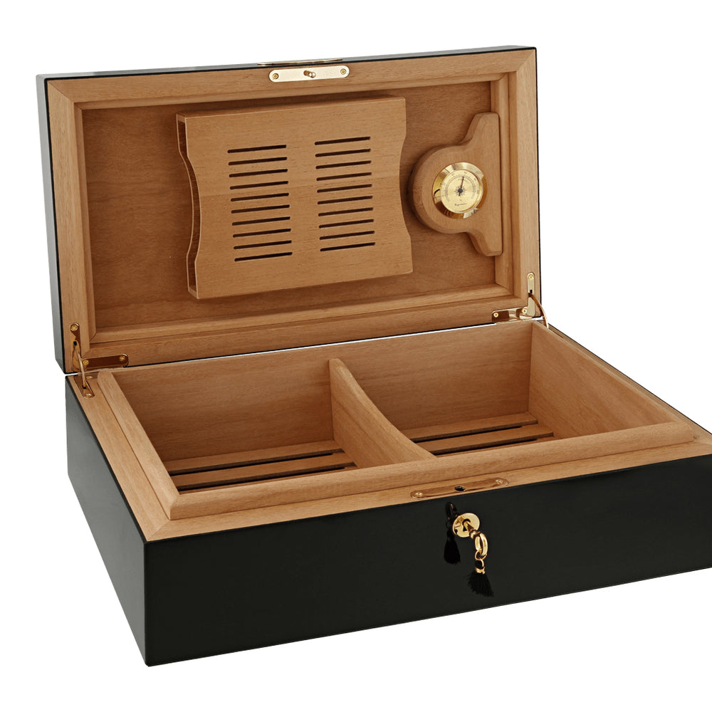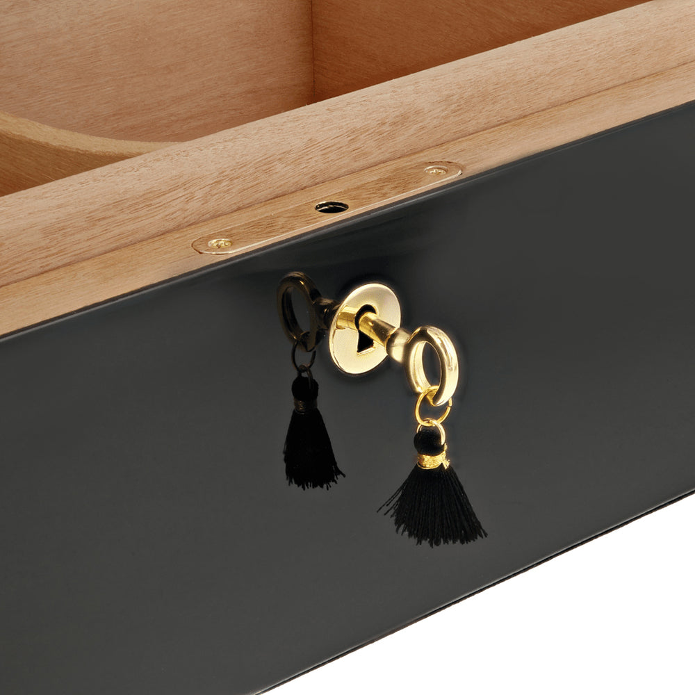 The humidor holds up to 100 Corona-sized cigars in its Spanish cedar-lined interior, preserving aroma and freshness with style. It includes an analog hygrometer, a Boveda humidification system with a dedicated stand, an interior divider, and a secure locking key set. A magnetic inner lid ensures an airtight seal to maintain optimal humidity.
