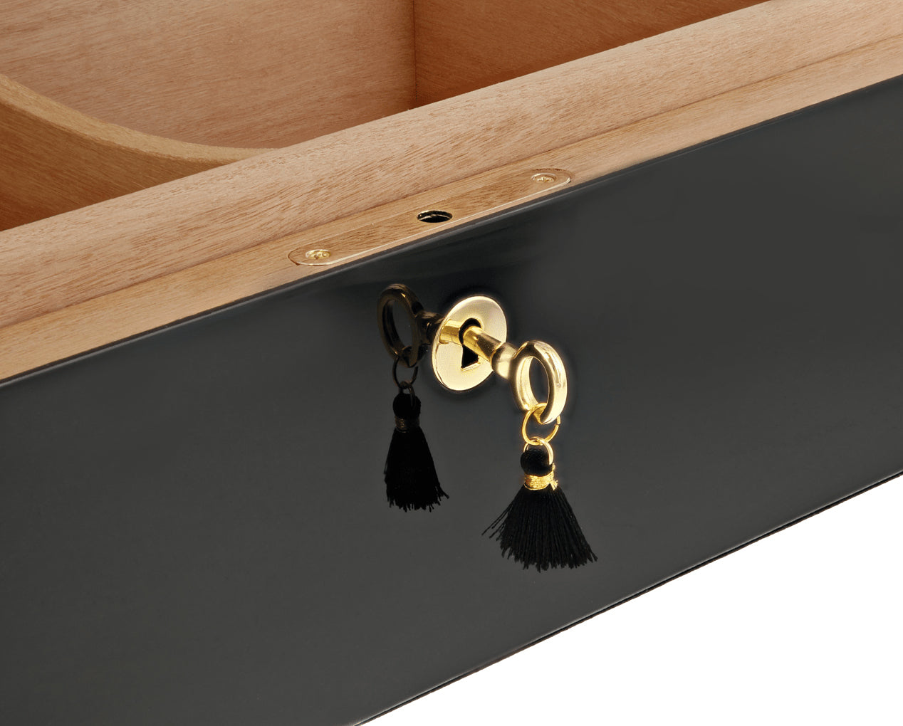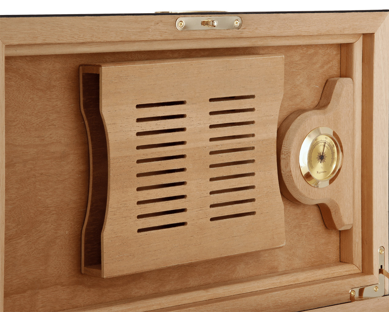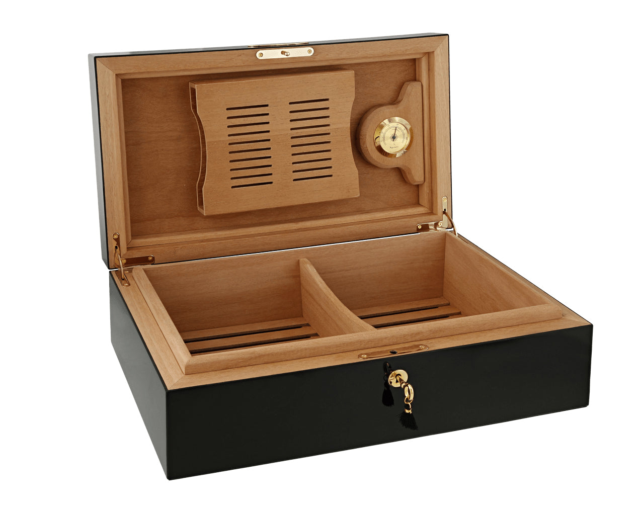 The humidor holds up to 100 Corona-sized cigars in its Spanish cedar-lined interior, preserving aroma and freshness with style. It includes an analog hygrometer, a Boveda humidification system with a dedicated stand, an interior divider, and a secure locking key set. A magnetic inner lid ensures an airtight seal to maintain optimal humidity.